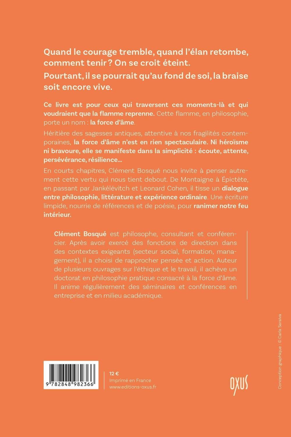 Quand le courage tremble, quand l’élan retombe, comment tenir?? On se croit éteint. Pourtant, il se pourrait qu’au fond de soi, la braise soit encore vive. Ce livre est pour ceux qui traversent ces moments-là et qui voudraient que la flamme reprenne. Cette flamme, en philosophie, porte un nom : la force d’âme. Héritière des sagesses antiques, attentive à nos fragilités contemporaines, la force d’âme n’est en rien spectaculaire. Ni héroïsme ni bravoure, elle se manifeste dans la simplicité : écoute, attente, persévérance, résilience… En courts chapitres, Clément Bosqué nous invite à penser autrement cette vertu qui nous tient debout. De Montaigne à Épictète, en passant par Jankélévitch et Leonard Cohen, il tisse un dialogue entre philosophie, littérature et expérience ordinaire. Une écriture limpide, nourrie de références et de poésie, pour ranimer notre feu intérieur.